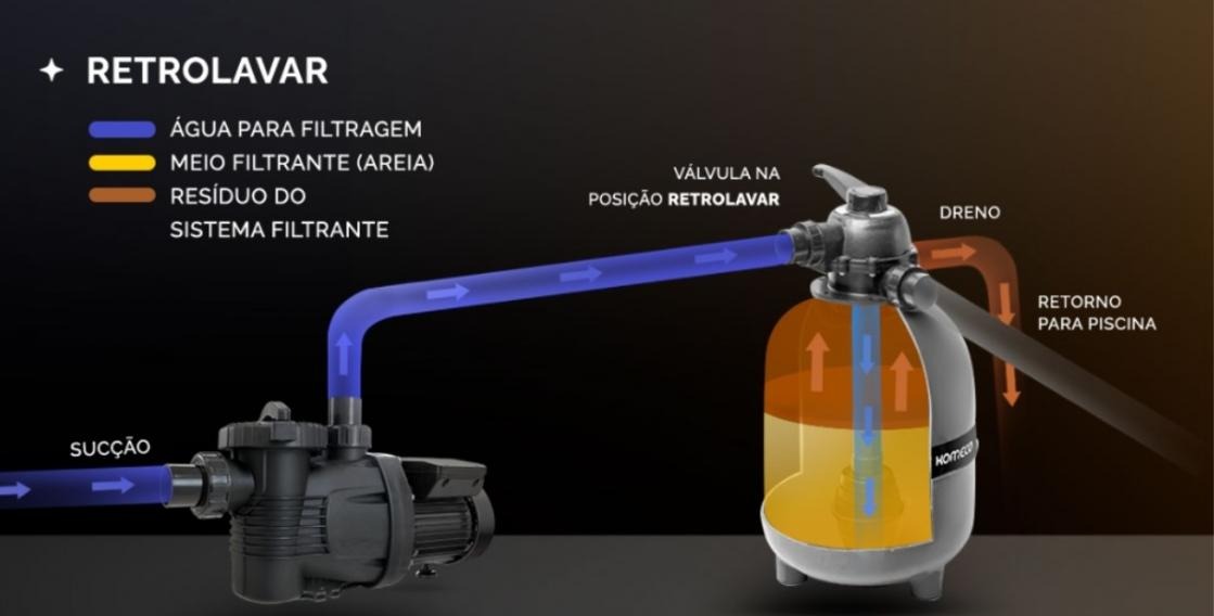 Além da troca periódica da areia, o filtro precisa passar por **retrolavagem** regularmente.